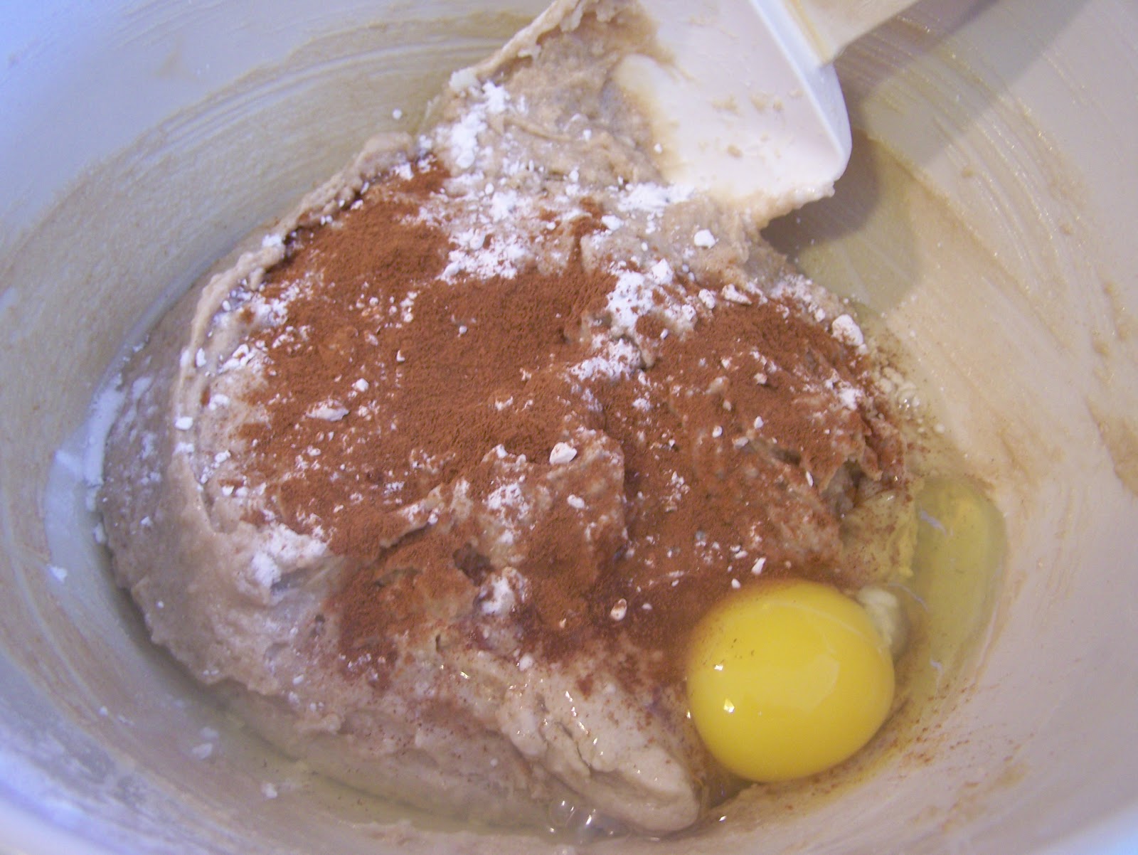Add baking soda, baking powder, cinnamon and egg.