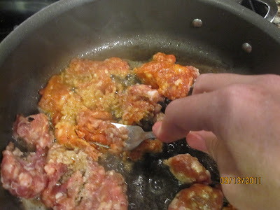 With the back of a fork, begin to break up the sausage meat